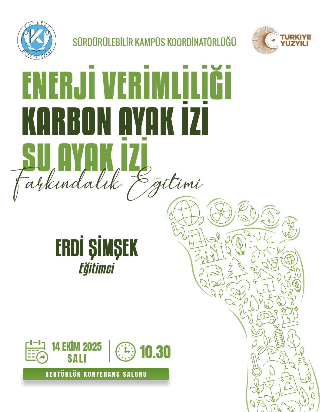 14 Ekim 2025 Salı günü saat 14:30'da Rektörlük Binası Konferans Salonunda gerçekleştirilecek olan Enerji Verimliliği Karbon Ayak İzi - Su Ayak İzi Farkındalık Eğitimine davetlisiniz.