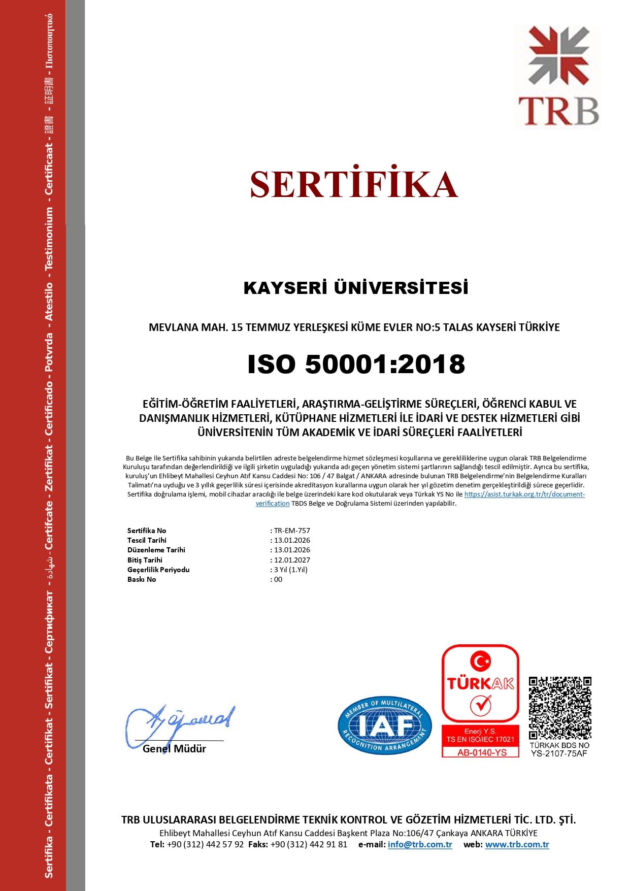 TRB Uluslararası Belgelendirme Kuruluşu tarafından gerçekleştirilen titiz denetimler sonucunda; eğitim-öğretimden Ar-Ge süreçlerine, kütüphane hizmetlerinden idari destek birimlerine kadar tüm akademik ve idari süreçlerimizin enerji yönetimi standartlarına tam uyum sağladığı tescil edilmiştir. Denetim neticesinde, üniversitemizin ISO 50001:2018 belgesinin geçerliliği 1 yıl süreyle daha onaylanmıştır.